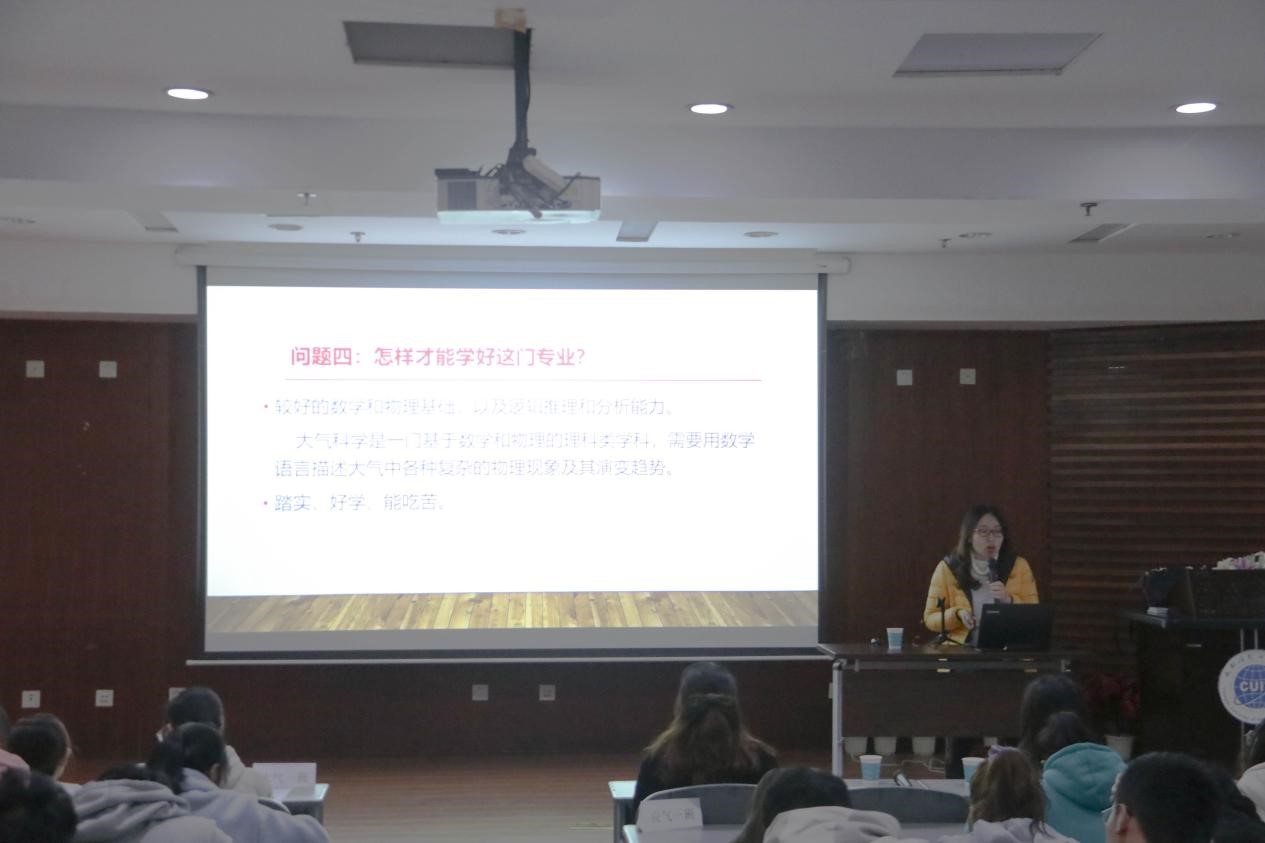 许东蓓围绕大气科学与天气预报服务,灾害、转折、关键性天气预报服务、重大活动气象保障以及突发公共事件气象应急服务为同学们做出介绍,她特别指出一个合格的预报员应该具有对数据资料的综合应用能力、对天气形势的仔细研判能力、对天气系统的密切跟踪能力,对天气现象的实时监视能力以及对未来天气的准确预报能力。不仅如此,预报员要对气象事业敬业、精益、专注、创新。