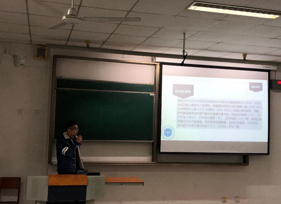 黄开龙的报告题目是《气象条件对深圳市上呼吸道感染就诊人数的影响》,他选取2014-2017年深圳市罗湖区49家社区服务中心年逐日的上感就诊人数资料配合同期的气象数据,将数据进行分类处理后,通过对深圳市上感就诊人数及其性别、年龄与气象要素的Spearman相关性分析,得出在不同季节上呼吸道感染与不同气象要素间的相关程度不同的结论,最后利用分布滞后非线性模型建立疾病预测模型,揭示出不同气象、环境要素与疾病的暴露-反应关系。